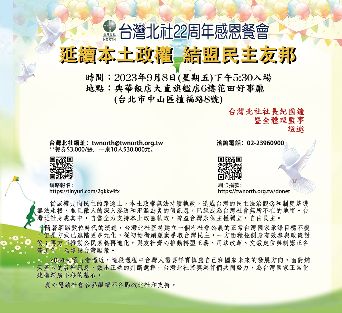 台灣北社22周年感恩餐會擇定9月8日舉行,廣邀各界共參盛會。