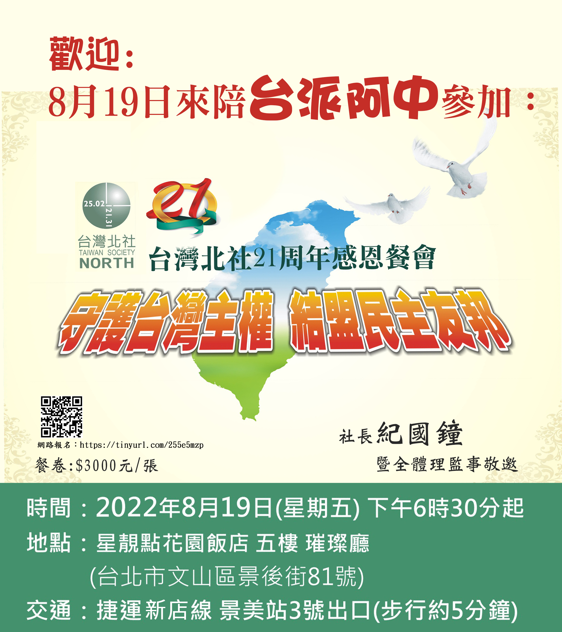 台灣北社8/19晚上將在景美星靚點花園飯店(台北市文山區景後街81號)舉辦21周年感恩餐會,除了力邀台派阿中和現場來賓相見歡,也邀請立法院長游錫堃談台灣國家正常化、涂醒哲部長憶述中國國民黨操作林智堅論文案和他的舔耳案手法類似處和隱藏的因素。