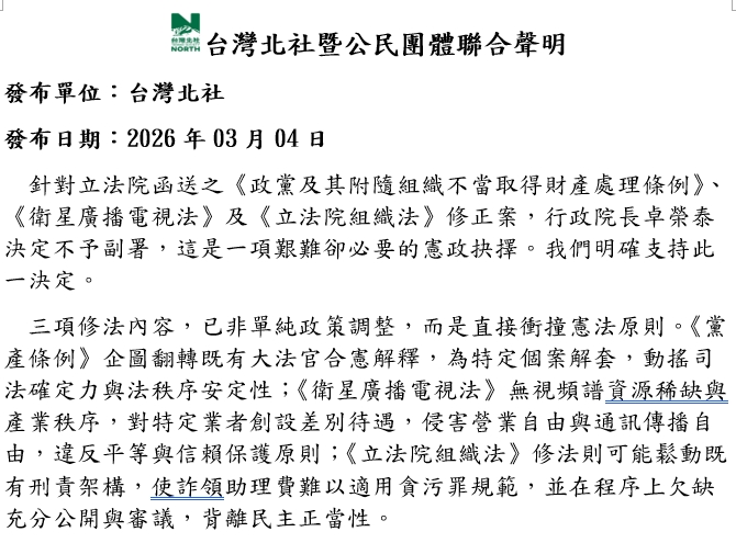 20260304【支持卓揆不副署黨產條例等爭議法案】台灣北社暨公民團體聯合聲明