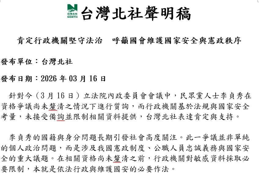 20260316「肯定行政機關堅守法治 呼籲國會維護國家安全與憲政秩序」北社等聯合聲明稿