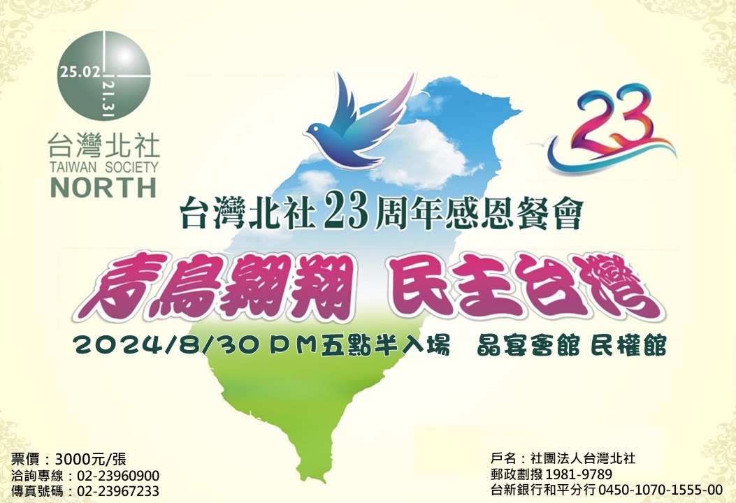 熱誠歡迎參加8月30日台灣北社22周年感恩餐會